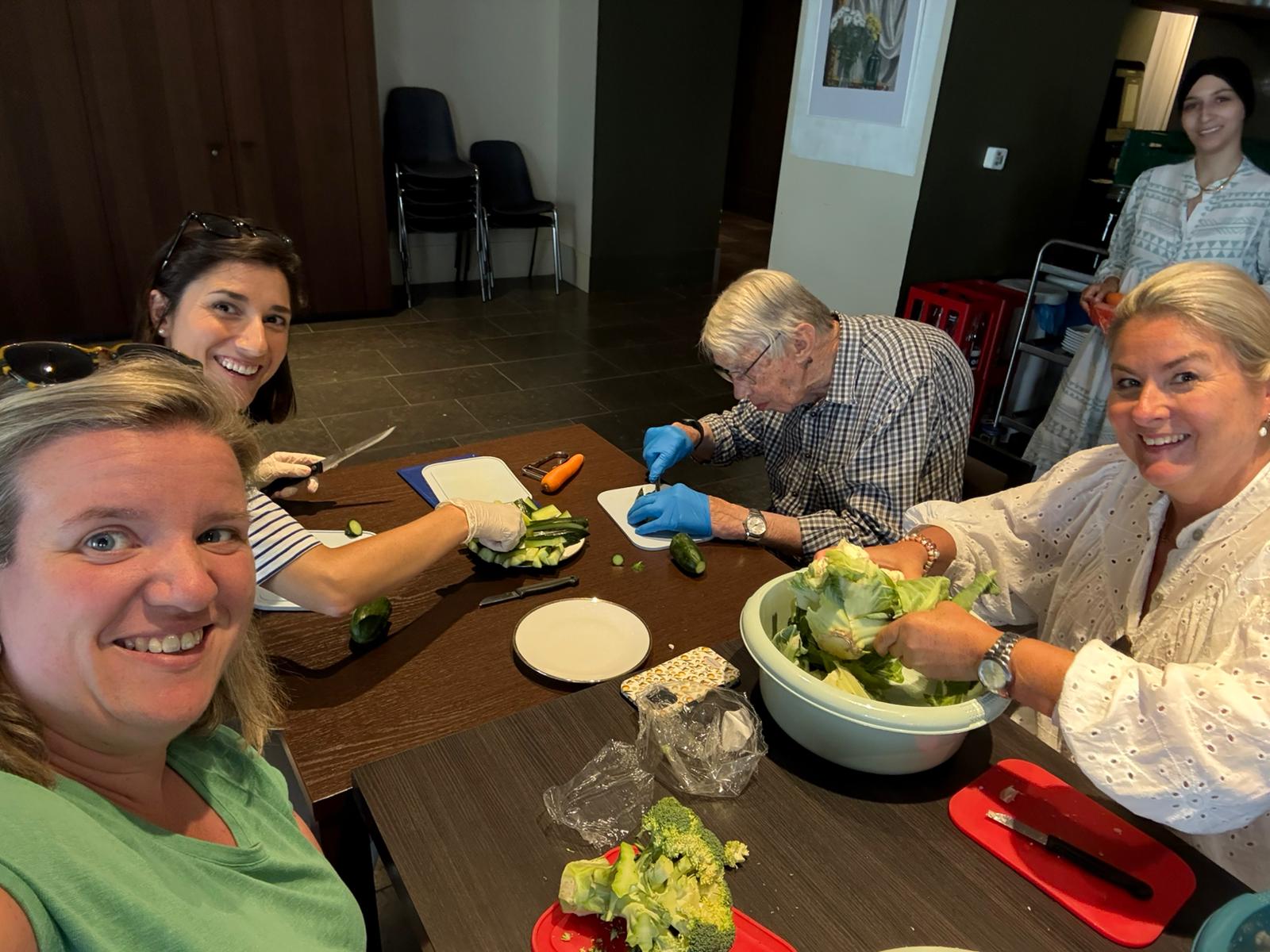 Ook in Franki was de inzet groot. Tijdens een themadag rond Zuid-Amerika hielpen drie collega’s mee bij de voorbereidingen: van aperitieven klaarmaken tot bediening aan tafel. De dag eindigde in een dansmoment met bewoners, een warme herinnering voor iedereen die erbij was.